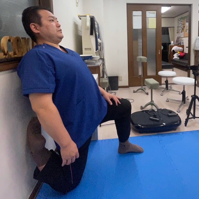 壁に伸ばしたい側の足の甲を当てるようにして、膝を壁から15cm程度のところでつき、反対側の足を立てて片膝立ちになった状態で上半身を起こします。